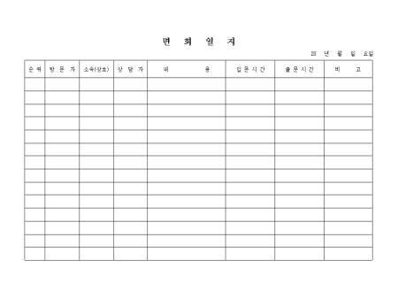 방문자에 따른 면회내역을 기록하는 면회일지 양식입니다.