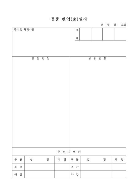 물품의 반입과 반출내역을 기재하는 양식입니다.