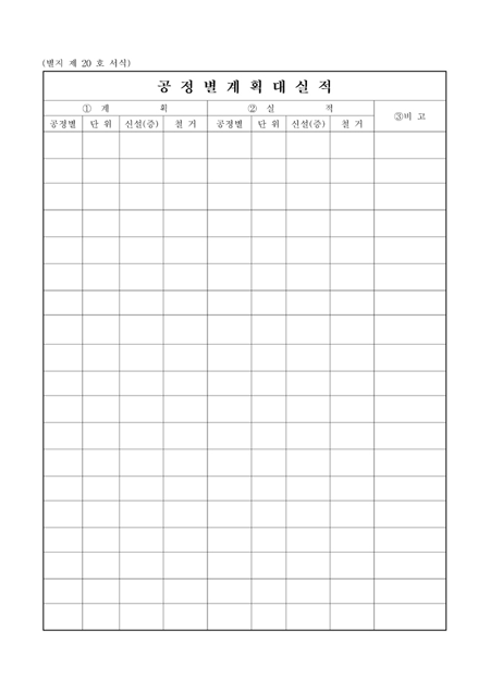 계획과 실적의 공정별,단위,신설,철거를 기록하는 공정별계획대실적 양식입니다.