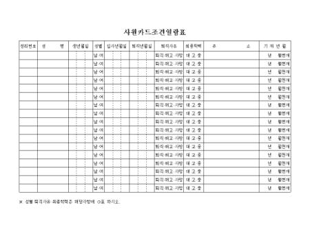 성명, 생년월일, 성별, 입사년월일, 퇴직년월일, 퇴직사유, 최종학력등으로 구성되어 있는 사원카드조견 일람표양식입니다.