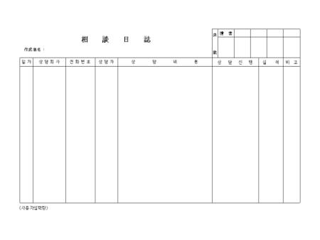 상담회사, 전홥너호, 상담자, 상담내용,상담진행, 실적등으로 구성되어 있는 상담일지 양식입니다.