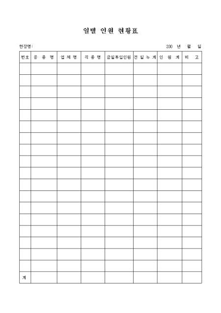 일별 인원 현황표 양식으로 공종명, 업체명, 직종명, 금일투입인원, 전일누계, 인원계등의 항목으로 구성되어 있습니다.