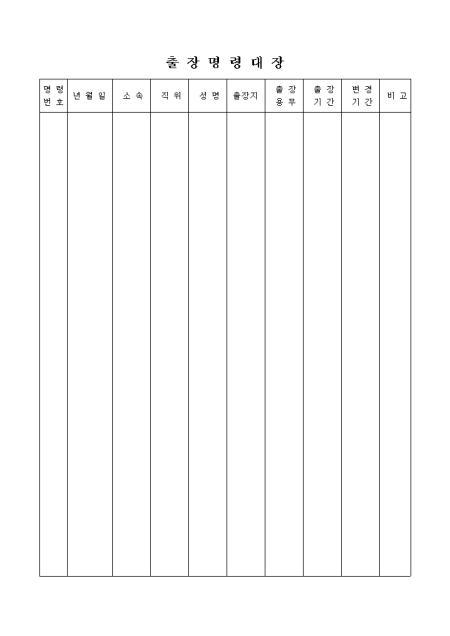 출장명령의 내역을 기록하는 양식으로 출장지, 출장용무, 출장기간, 변경기간등의 항목으로 구성되어 있습니다.