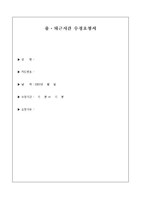 출퇴근시간 수정을 요청할 때 사용하는 양식입니다. 수정시간과 요청사유에 대해 기입하도록 되어 있습니다.