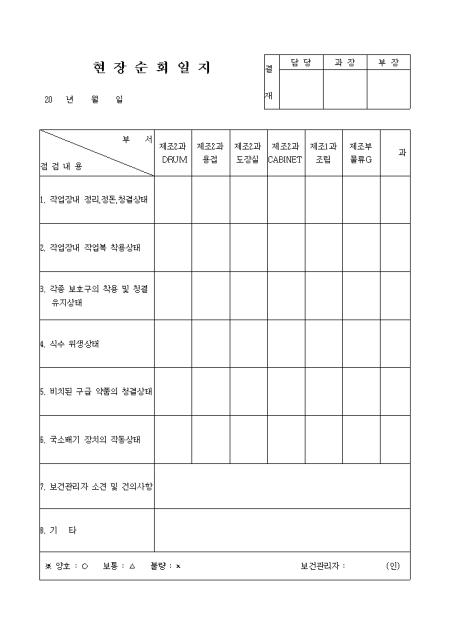 점검내용에 따른 부서별 현장 순회일지양식입니다.