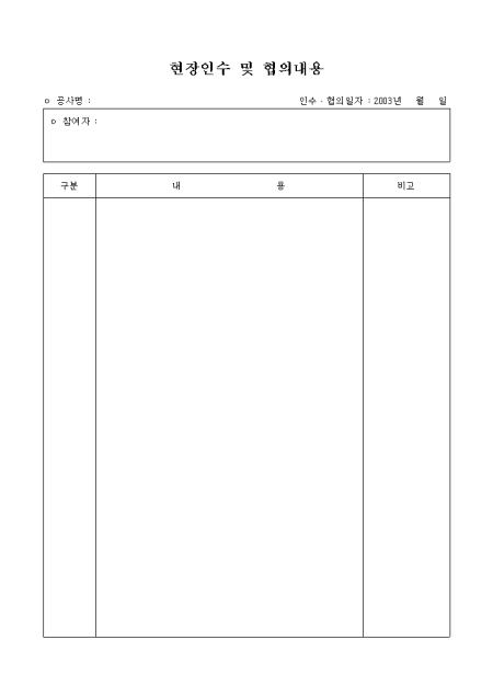 공사의 현장인수 내역을 기재하고 그에 따른 협의내용을 기록하는 양식입니다.