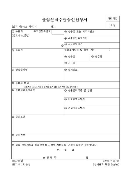대외무역법시행령 제46조의 규정에 의하여 수출승인을 받을때 사용하는 양식입니다.