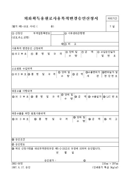 대외무역관리규정 제4-2-19조의 규정에 의하여 외화 획득용 원료사용 목적 변경 승인(신청)할때 사용하는 서식입니다.