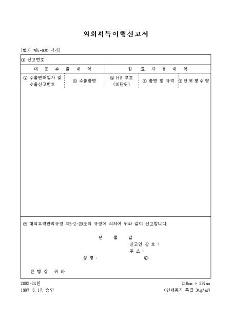 대외무역관리규정 제4-2-17조의 규정에 의하여 외화획득이행신고를 할때 사용하는 양식입니다.