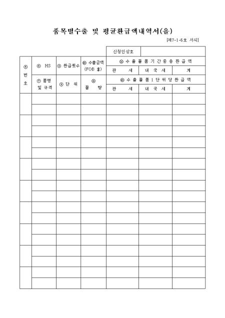 제7-1-6서식인 품목별수출 및 평균환급액 내역서(을)입니다.