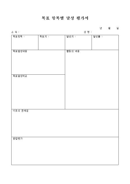항목별로 목표치 달성에 대한 평가양식으로 목표항목, 목표치, 달성치, 달성률, 목표달성내용, 목표달성비교등의 항목으로 구성되어 있습니다.