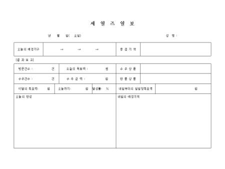 세일즈 예정지구를 정해 하루동안의 방문건수와 목표액, 수주건수.금액, 반품상품등을 기재하여 하루동안의 내역을 기록하는 양식입니다. 오늘의 반성 뿐아니라 내일 예정지역도 꼼꼼히 기재하도록 되어 있습니다.