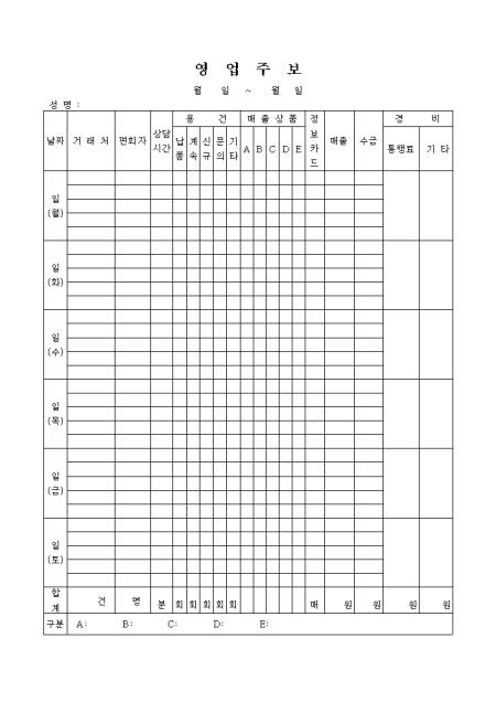 한주간 영업업무에 관한 활동내역을 정리하는 영업주보양식입니다.