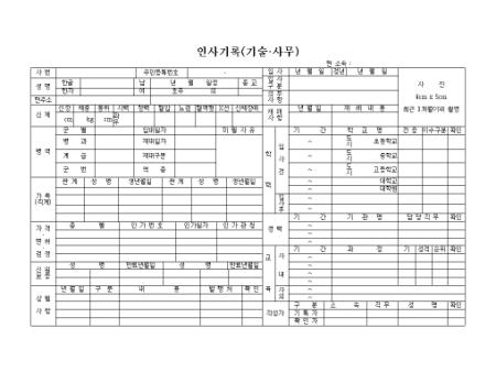 기술,사무분야 종사직의 인사기록카드양식입니다.